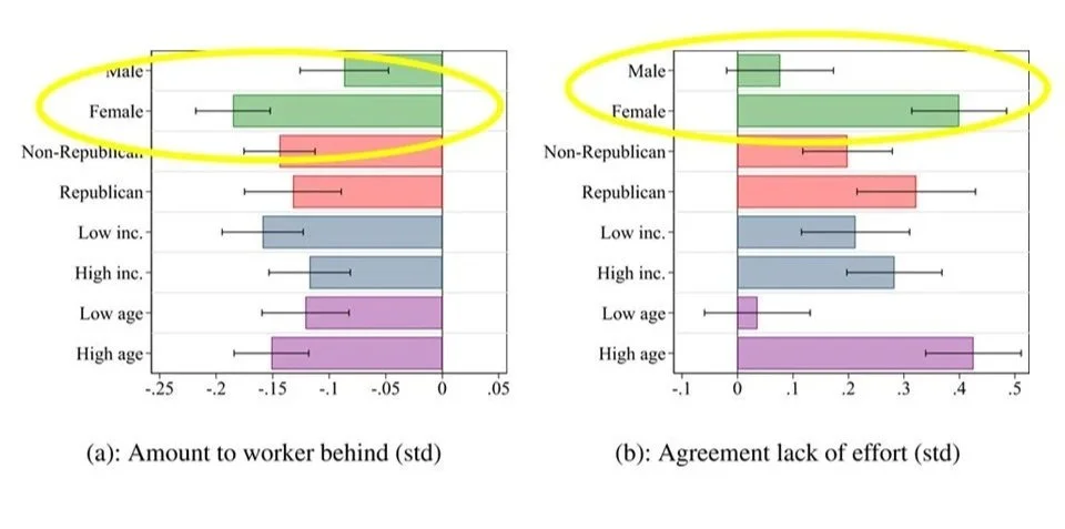 Although bias against men was shown by both men and women, another finding of the study was the bias was larger from women than from men in three out of four of their research questions. The circled section in Fig 3a (below, left) shows that both men and women in Study 1 redistributed more earnings to the lower performing worker if the lower performing worker was female rather than male, but that the effect was bigger (shown by the longer bar within the circle) when women were making the redistributions.